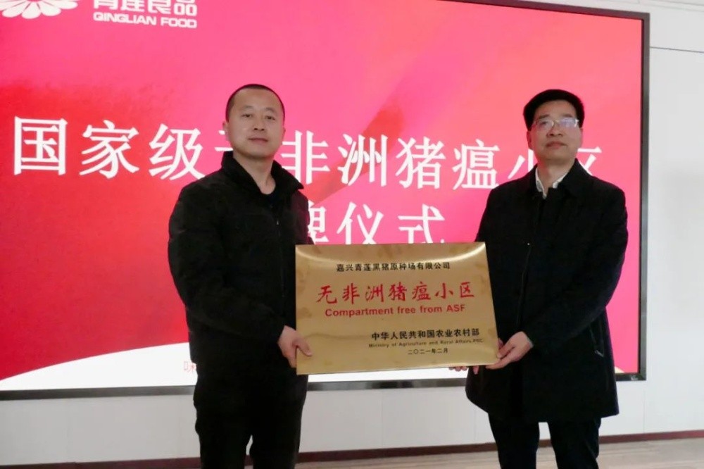 2022年1月25日,青蓮旗下嘉興青蓮黑豬原種場有限公司正式受牌國家級首批“無非洲豬瘟小區(qū)”榮譽,浙江僅2家。